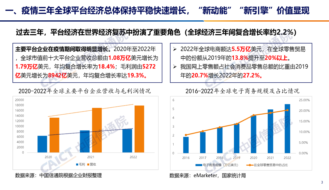 报告认为,过去三年,平台经济在世界经济复苏中扮演了重要角色,“新动能”“新引擎”作用凸显。但平台经济高速发展面临挑战。