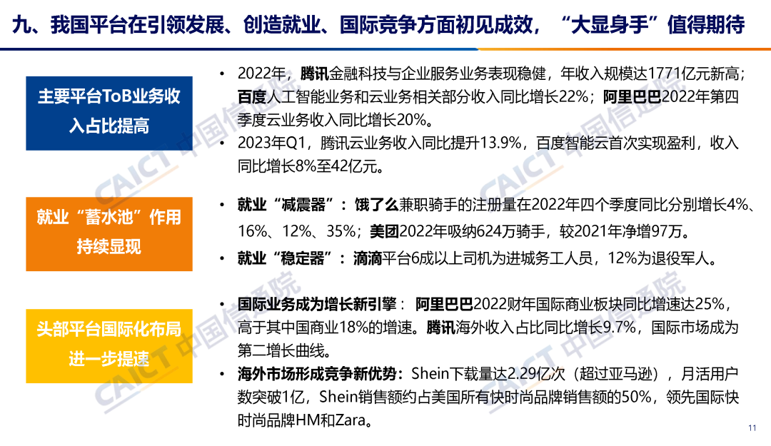 对于中国平台企业,报告认为,我国平台企业加快从高速增长向高质量发展转型。2022 年,主要平台 ToB 业务收入占比均有所提高,业务结构从消费互联网向产业互联网优化调整。平台企业就业“蓄水池”作用持续显现,外卖、网约车等平台为摩擦性失业群体提供了大量过渡性工作机会;社交、电商、短视频等平台激活了更多职业形式。头部平台企业国际业务收入持续增长,国际化布局进一步提速。