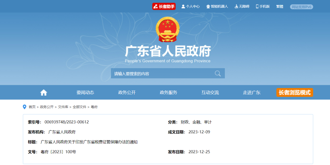 近日,广东省人民政府办公厅印发《广东省税费征管保障办法》(以下简称《办法》)。《办法》包括总则、信息共享、服务支持、征缴协助、监管协作、执法协助、责任追究、附则共八章四十三条。《办法》自2024年1月1日起施行,有效期5年。